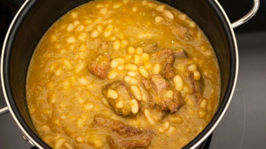 Agrega la costilla y las pochas. Cubre con agua y pon a punto de sal. Coloca la tapa y cocina todo a fuego suave durante 25-30 minutos. Si el caldo está ligero mueve la cazuela de vez en cuando.